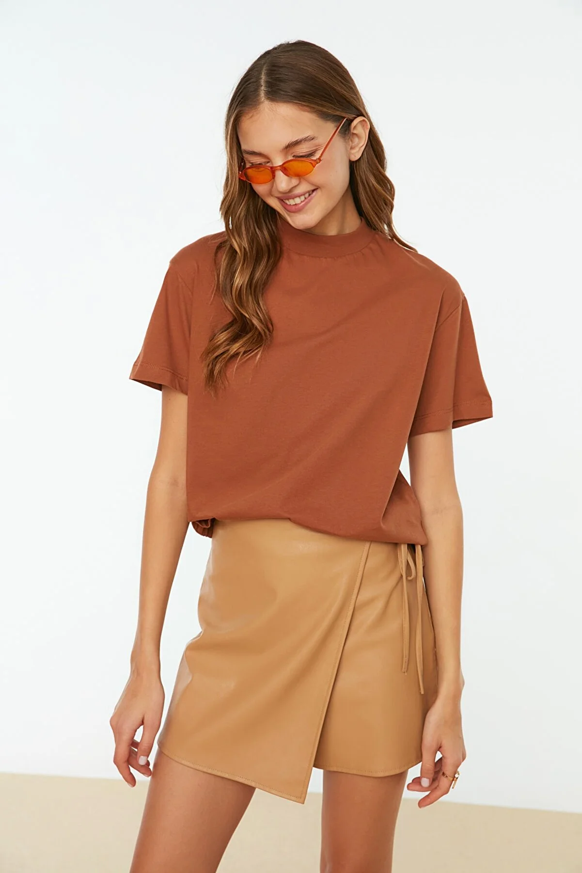 Kahverengi Dik Yaka Basic Örme T-Shirt